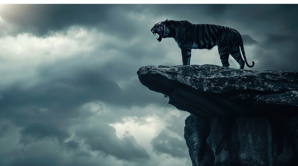 A traveler runs into a tiger. The tiger chases him until he comes to a precipice. Holding on to the root of a wild vine, he swings over the edge. Looking down, the man sees another tiger far below, waiting to eat him. The vine is the only thing that is tethering him to life. But his problem does not end there. Two mice, one white and one black, are gnawing at the vine. Right at that moment, the man sees a delicious strawberry growing on a bush, within reach. Grasping the vine with one hand, the man plucks the strawberry with the other hand. How sweet it tastes!