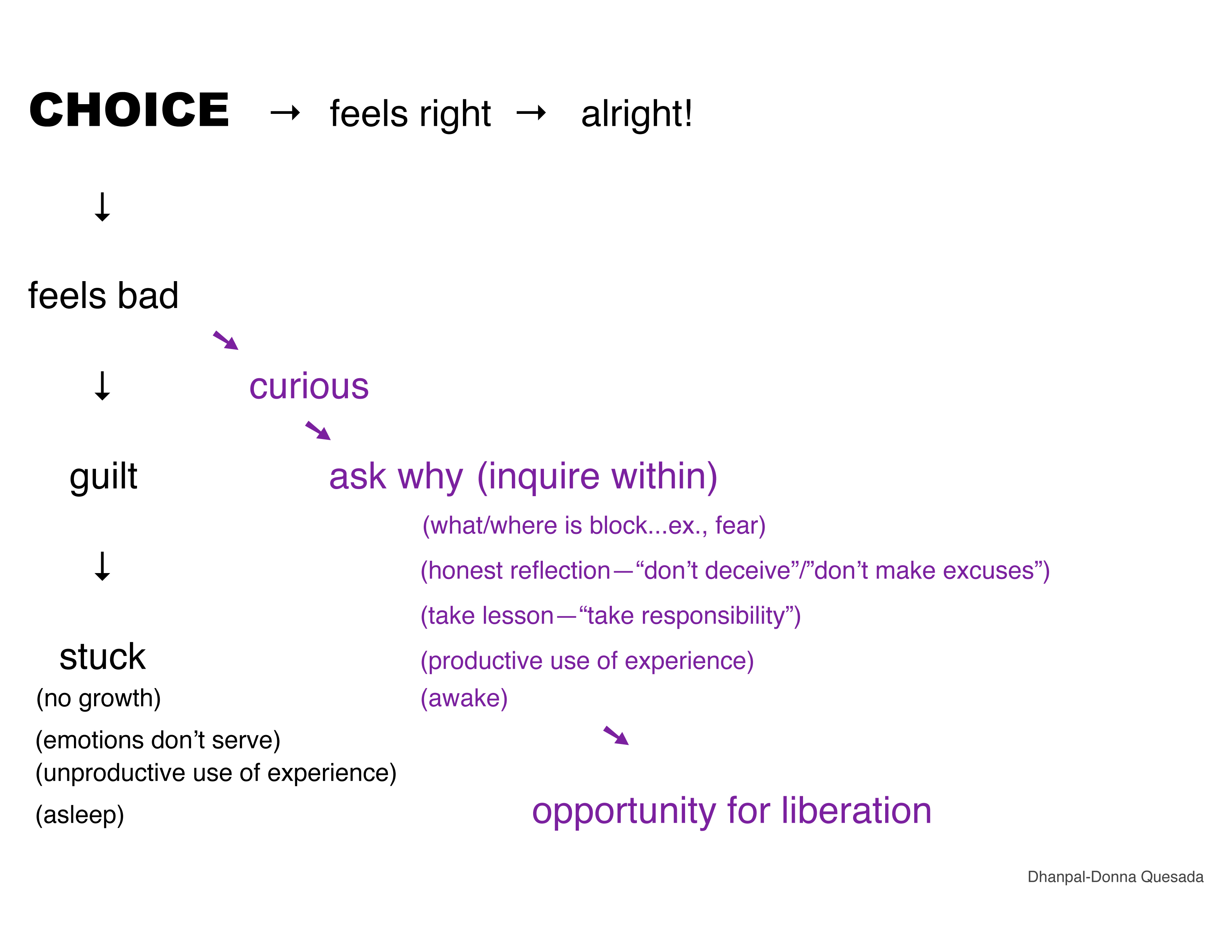 This chart shows us that even when we feel we have not acted optimally, in a situation…say, by lashing out instead of breathing, as in the example above, we can use that moment as an opportunity for conscious reflection, rather than self-reproach. For, emotions like guilt, serve only to block our growth. But the recognition that there may be some fear, like the fear of losing control, underlying our frustration, will set us free. It disables that fear.